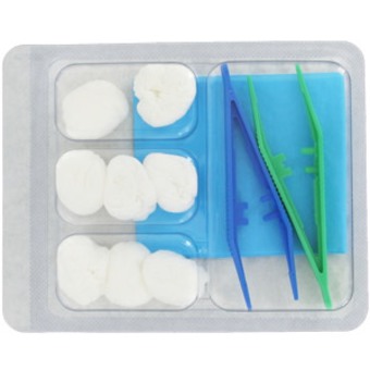 Set de soins usage unique stérile permettant de réaliser des soins cutanés : 1 pince anatomique bleue, 1 pince anatomique verte, 1 champ patient non tissé&polyéthylène (38x45cm), 5 boules de gaze, 5 compr. NT 30g 7.5x7.5cm, étiquette de traçabilité -