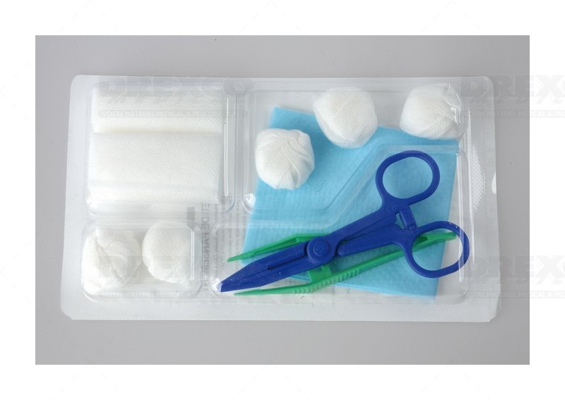 Set de soins à usage unique stérile permettant de réaliser des soins cutanés: 1 pince anatomique verte, 1 pince Kocher bleue, 1 champ patient non tissé&polyéthylène (38x45cm), 5 boules de gaze, 5 compr. NT 30g 7.5x7.5cm, Etiquette de traçabilité -