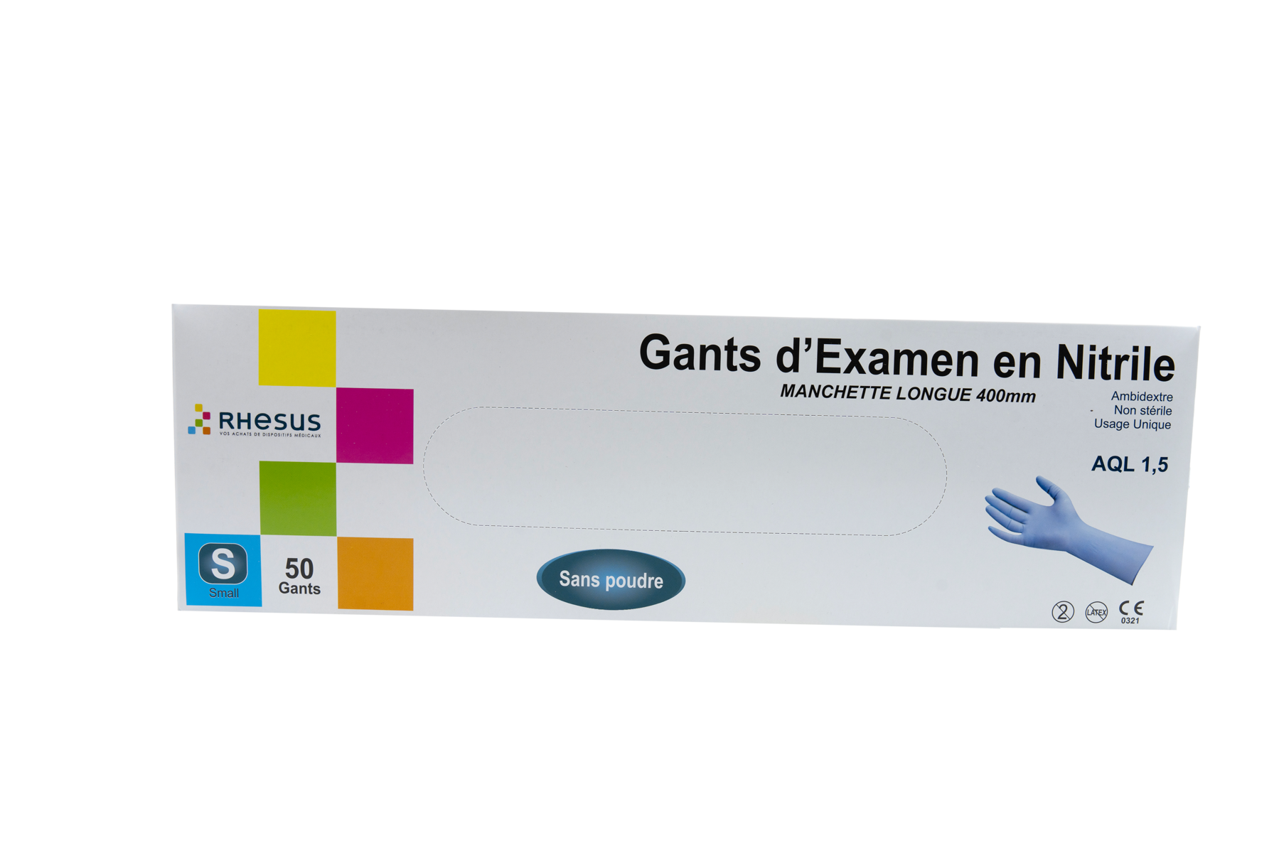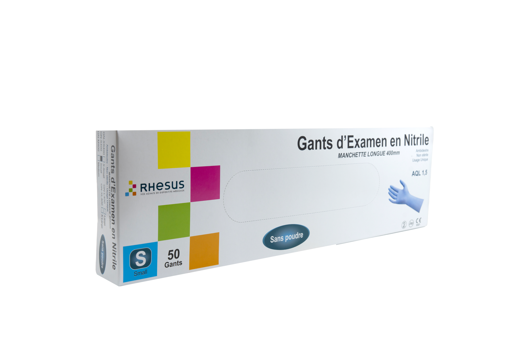 - ACCUEIL > GANTS EXAMEN > GANT EXAM NON POUDRE NITRILE MANCHETTE LONGUE S