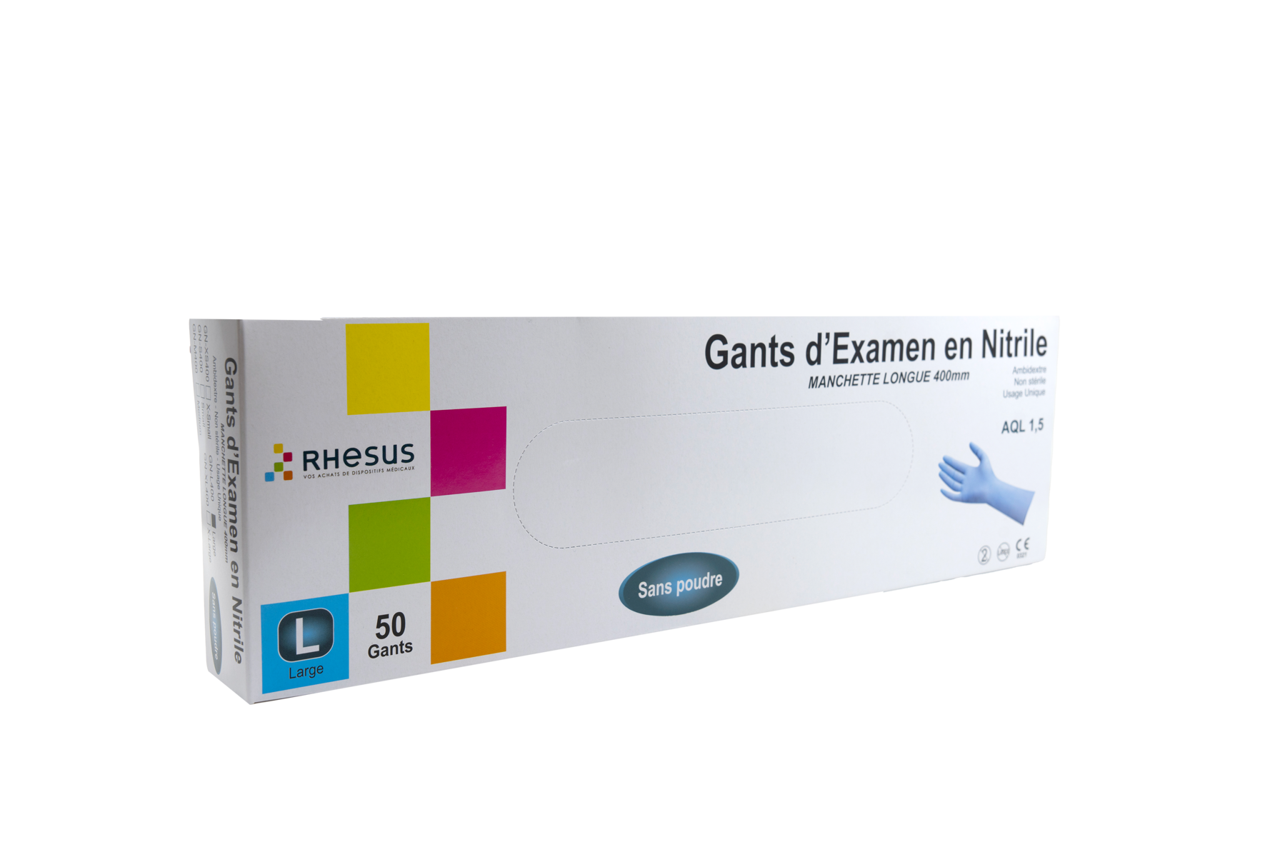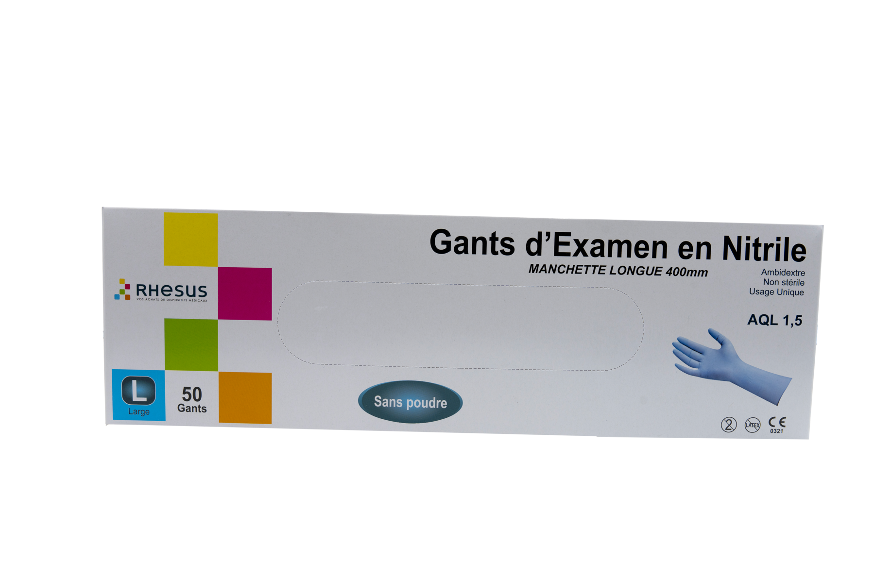 - ACCUEIL > GANTS EXAMEN > GANT EXAM NON POUDRE NITRILE MANCHETTE LONGUE L