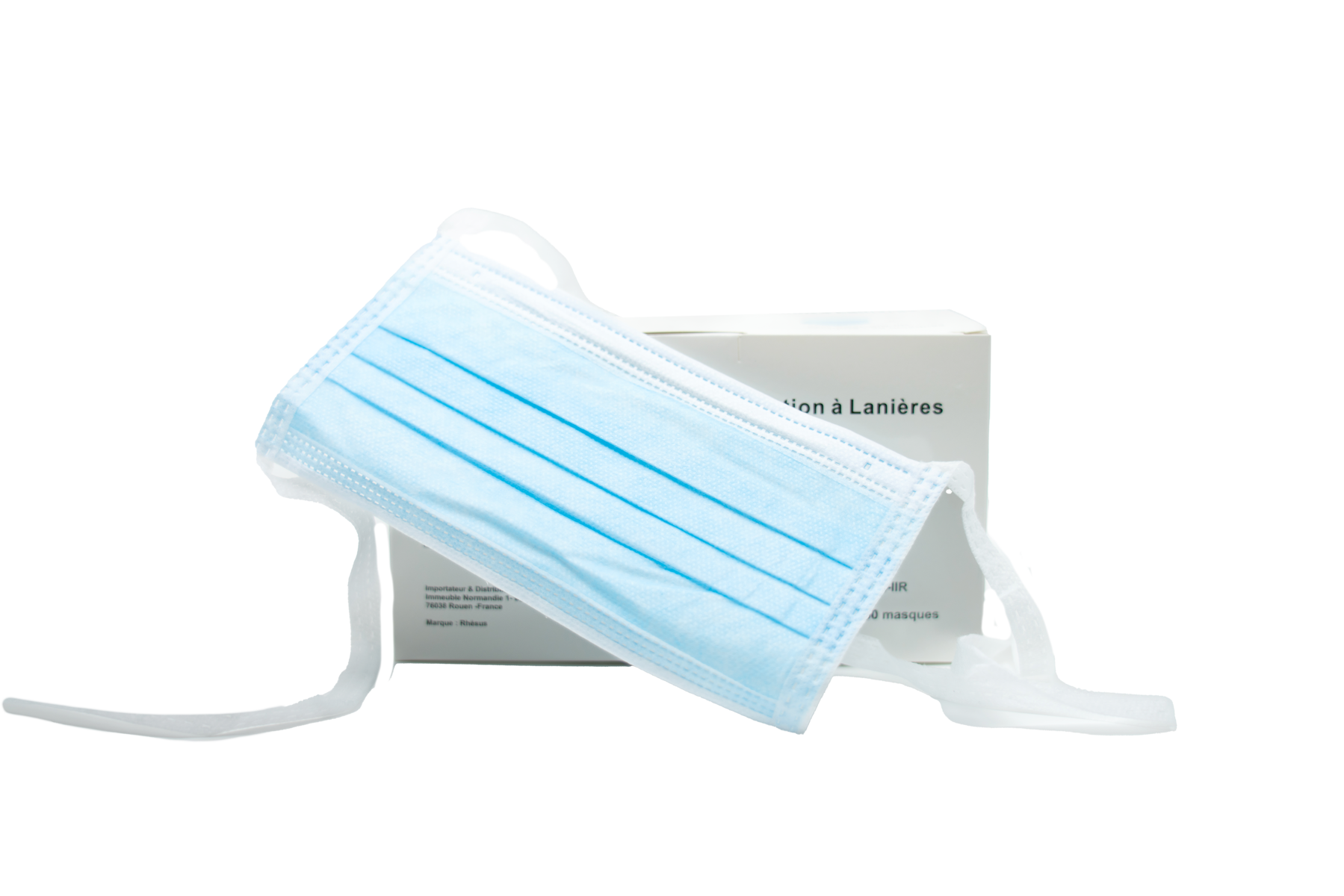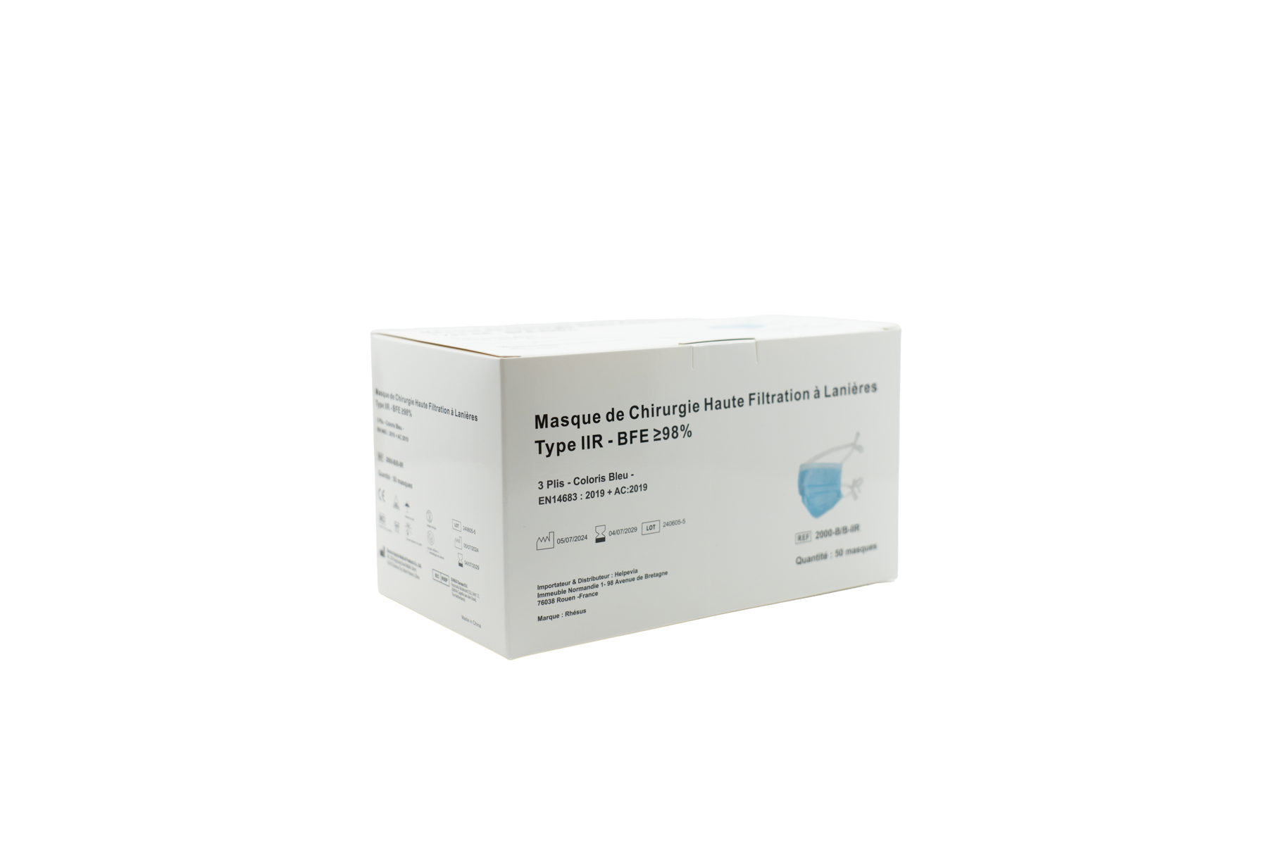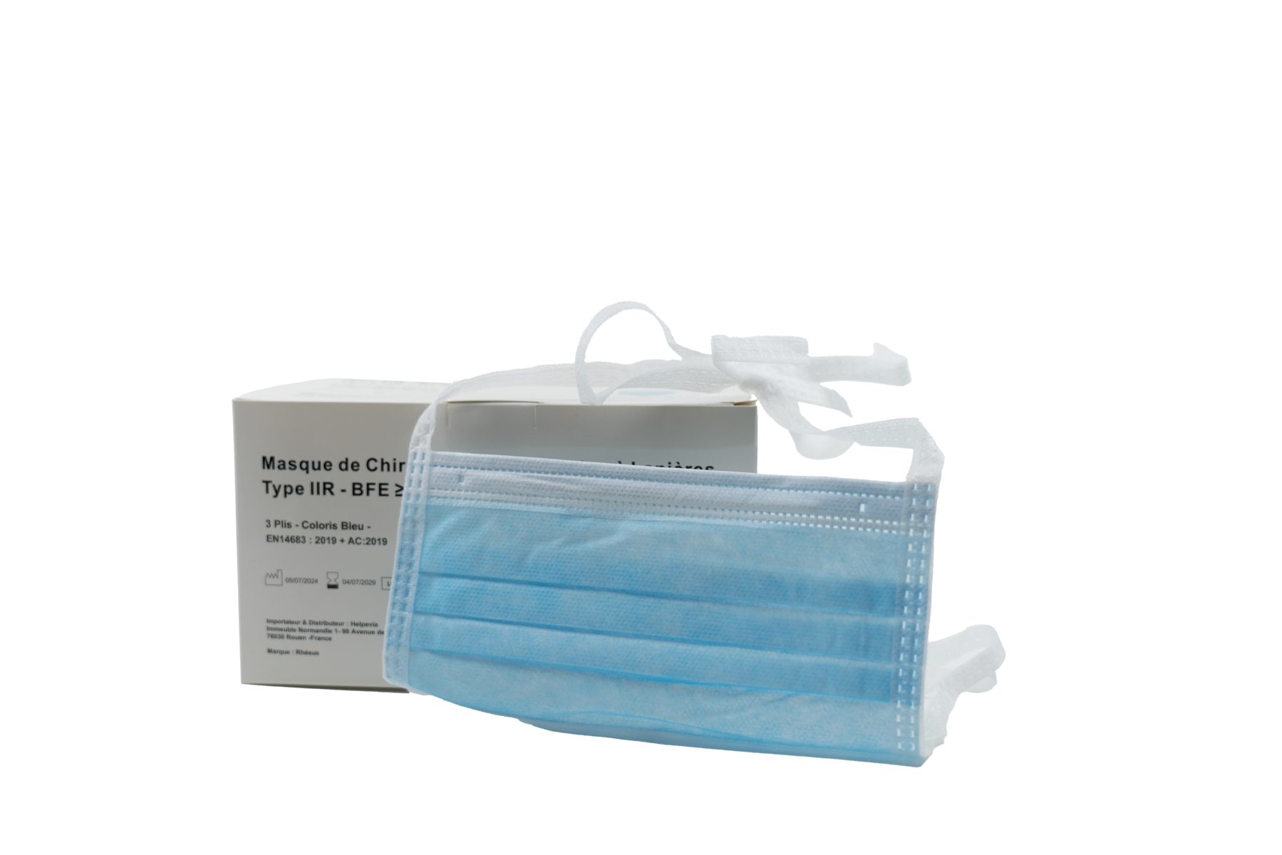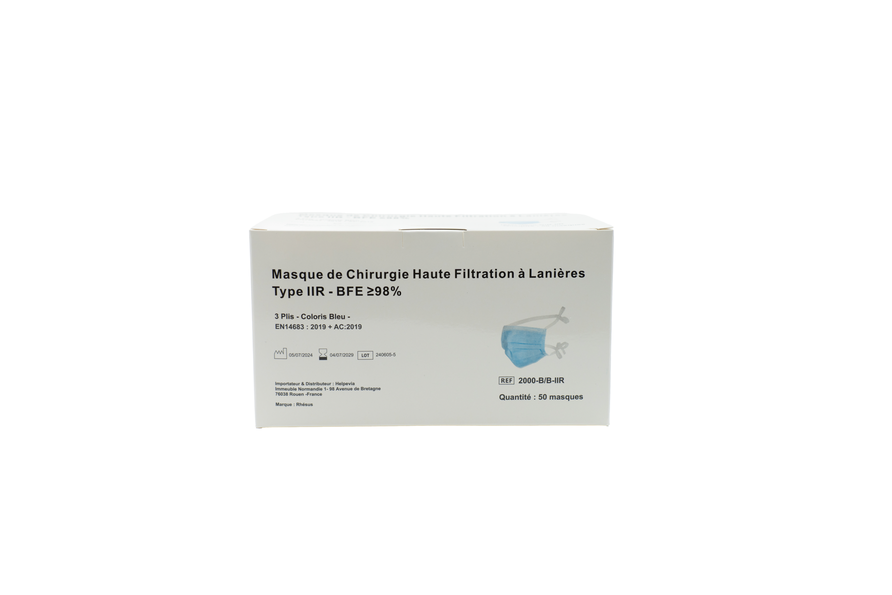 Masque de Chirurgie bleu à élastiques, 3 plis, type IIR très haute filtration selon EN14683. Boite de 50 masques. -